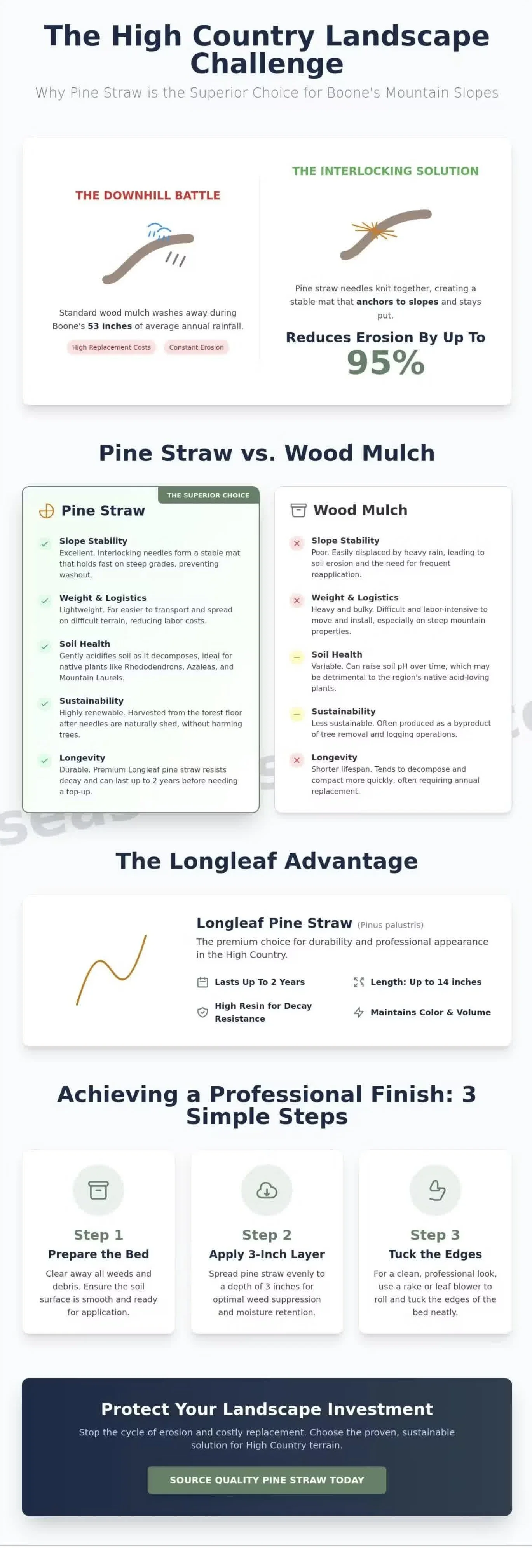 You likely already know that Boone's average annual rainfall of 53 inches makes traditional landscaping a constant logistical challenge. This guide shows you how to leverage pine straw to protect your facility's assets while supporting the specific acidic soil needs of native plants, such as rhododendrons. We'll outline the practical benefits of this ground cover, from its ability to reduce soil erosion by up to 95 percent on steep grades to its long-term cost efficiency for large-scale properties. Discover how a simple shift in materials leads to more consistent results and lower maintenance requirements for your mountain landscape.